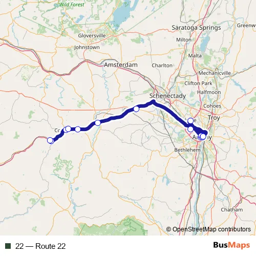 The first stop of the 22 bus route is Nysdot, 50 Wolf Road and the last stop is Price Chopper Plaza. 22 (Route 22) is operational during on weekdays.