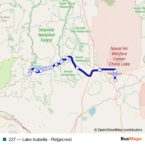 The first stop of the 227 bus route is Wal-Mart/China Lake Blvd. (780704) and the last stop is Kern Valley Plaza/Erskine Creek Rd. (760810). 227 (Lake Isabella - Ridgecrest) is operational during everyday.