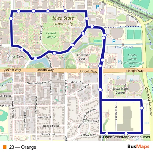 The first stop of the 23 bus route is Iowa State Center and the last stop is Iowa State Center. 23 (Orange) is operational during everyday.