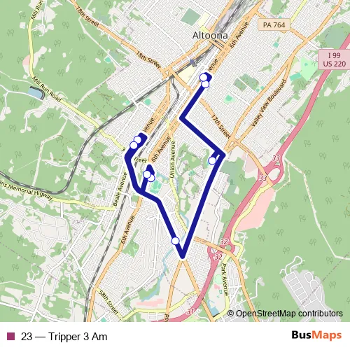 The first stop of the 23 bus route is 5th Ave & Amtran and the last stop is Altoona Area Junior High Tripper Stop. 23 (Tripper 3 Am) is operational during on weekdays.