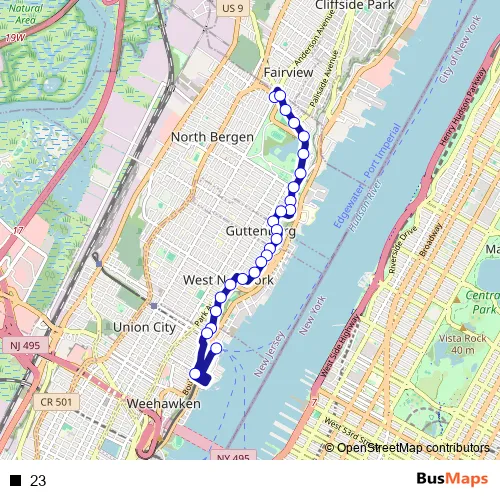 The first stop of the 23 bus route is Bergenline AVE AT JFK Blvd and the last stop is Port Imperial Ferry Terminal. 23 is operational during on weekdays.