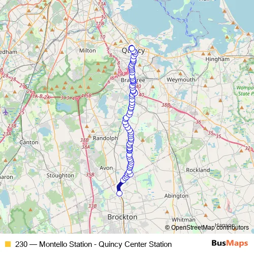 The first stop of the 230 bus route is Montello and the last stop is Quincy Center. 230 (Montello Station - Quincy Center Station) is operational during everyday.