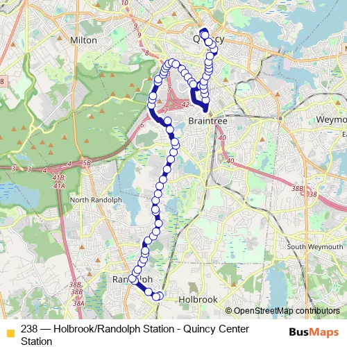 The first stop of the 238 bus route is Holbrook/Randolph and the last stop is Quincy Center. 238 (Holbrook/Randolph Station - Quincy Center Station) is operational during everyday.