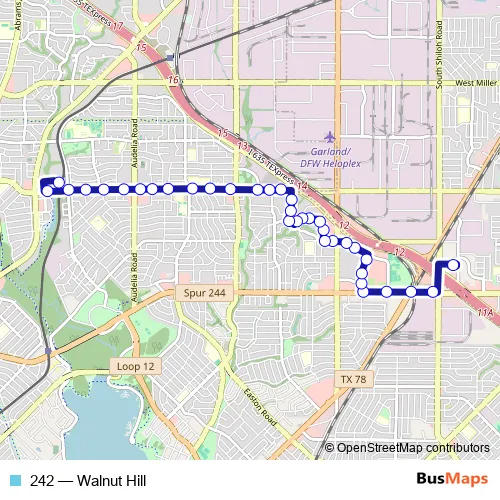 The first stop of the 242 bus route is South Garland Tc and the last stop is Lake Highlands Station. 242 (Walnut Hill) is operational during everyday.