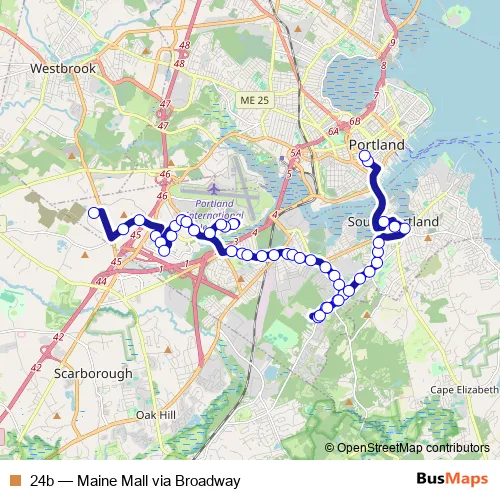 The first stop of the 24b bus route is 295 Gannett Dr and the last stop is Congress ST + Forest Ave. 24b (Maine Mall via Broadway) is operational during on weekdays.