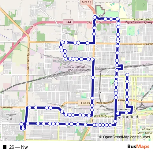 The first stop of the 26 bus route is Boonville & Division (Nw) and the last stop is City Utilities Transit Center. 26 (Nw) is operational during everyday.