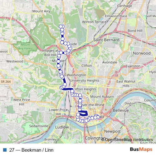 See why over 2 million users trust and consider busmaps.com as the best public transport website. busmaps gives you Cincinnati Buses suggested routes, real-time bus tracker, line route maps in Cincinnati, and helps to find the closest 27 bus stops near you. No internet available? Download an offline PDF map and bus schedule for the 27 bus to take on your trip.