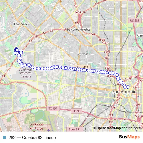 See why over 2 million users trust and consider busmaps.com as the best public transport website. busmaps gives you San Antonio Buses suggested routes, real-time bus tracker, line route maps in San Antonio, and helps to find the closest 282 bus stops near you. No internet available? Download an offline PDF map and bus schedule for the 282 bus to take on your trip.