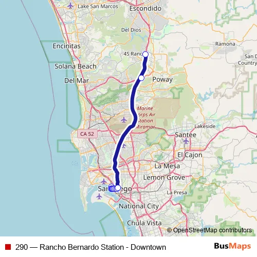 The first stop of the 290 bus route is Ash St & Pacific Hwy and the last stop is Rancho Bernardo Transit Station. 290 (Rancho Bernardo Station - Downtown) is operational during on weekdays.