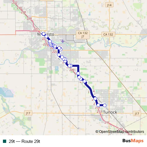 The first stop of the 29t bus route is Turlock Transit Center and the last stop is Bay A - Modesto Transit Center - Exit on. 29t (Route 29t) is operational during everyday.
