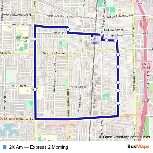 The first stop of the 2X Am bus route is Central & Cypress (Nb) and the last stop is Ham & Vine by Lodi Middle. 2X Am (Express 2 Morning) is operational during on weekdays.