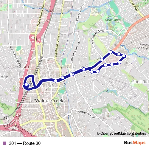 The first stop of the 301 bus route is Walnut Creek Bart and the last stop is Walnut Creek Bart. 301 (Route 301) is operational during on weekends.