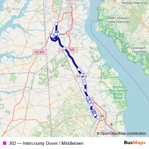 The first stop of the 302 bus route is North Middletown Park & Ride and the last stop is Dover Transit Center. 302 (Intercounty Dover / Middletown) is operational during everyday.