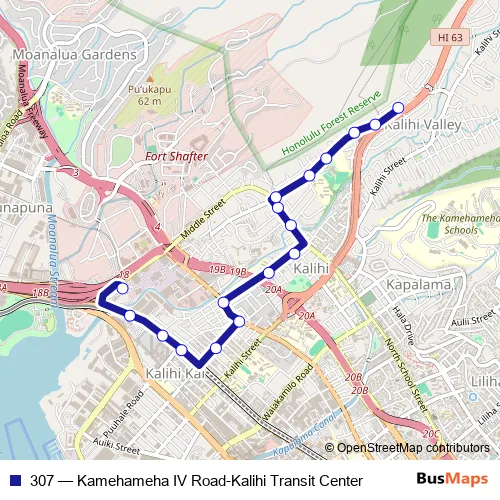 The first stop of the 307 bus route is Kalihi Transit Center and the last stop is Kalena DR + ALU St. 307 (Kamehameha IV Road-Kalihi Transit Center) is operational during everyday.