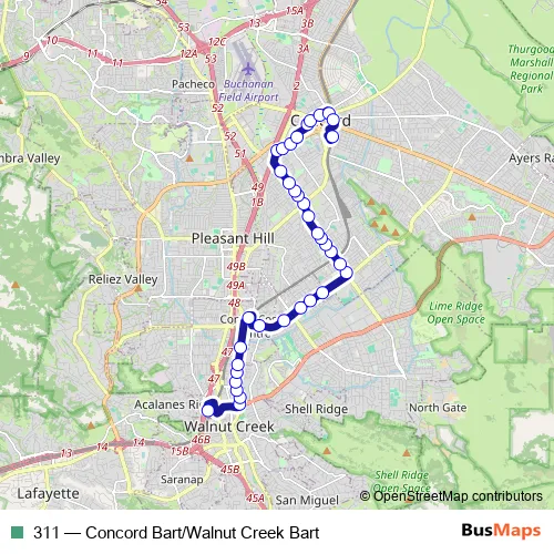 The first stop of the 311 bus route is Walnut Creek Bart and the last stop is Concord Bart. 311 (Concord Bart/Walnut Creek Bart) is operational during on weekends.