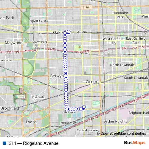 The first stop of the 314 bus route is Lake St & Cuyler Ave and the last stop is Morton College. 314 (Ridgeland Avenue) is operational during everyday.