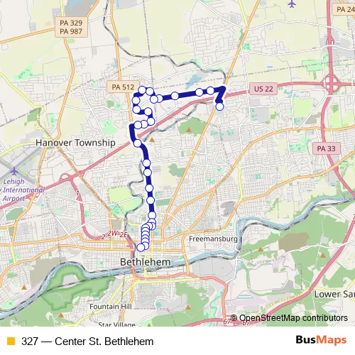 The first stop of the 327 bus route is Bethlehem Square and the last stop is BTC - 2 Platform. 327 (Center St. Bethlehem) is operational during on weekdays.