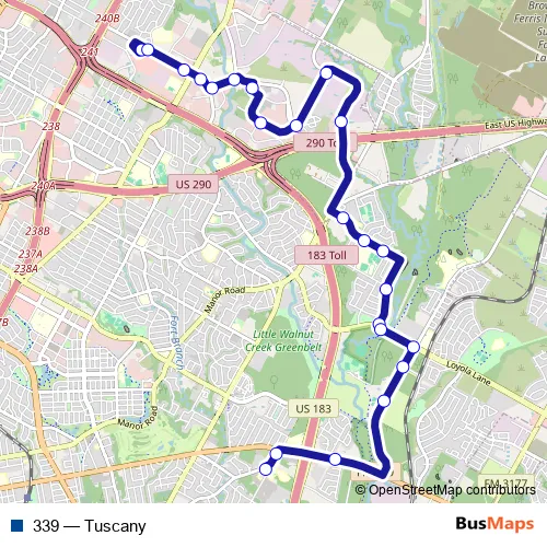 The first stop of the 339 bus route is Norwood Transit Center - C and the last stop is Tannehill/Webberville. 339 (Tuscany) is operational during everyday.