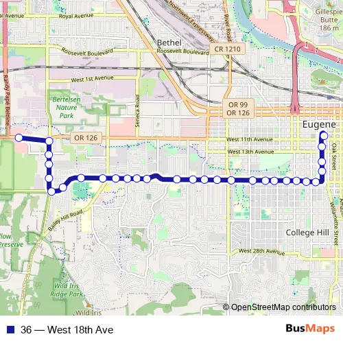 The first stop of the 36 bus route is S/S of 11th W of Commerce (Walmart) and the last stop is Eugene Station. 36 (West 18th Ave) is operational during everyday.