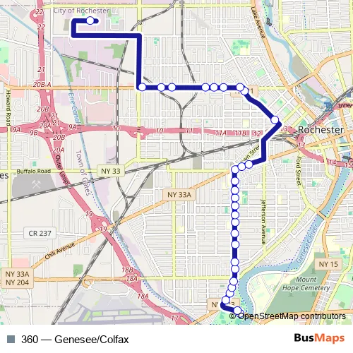 The first stop of the 360 bus route is Elmwood Loop and the last stop is Edison Tech High School. 360 (Genesee/Colfax) is operational during on weekdays.