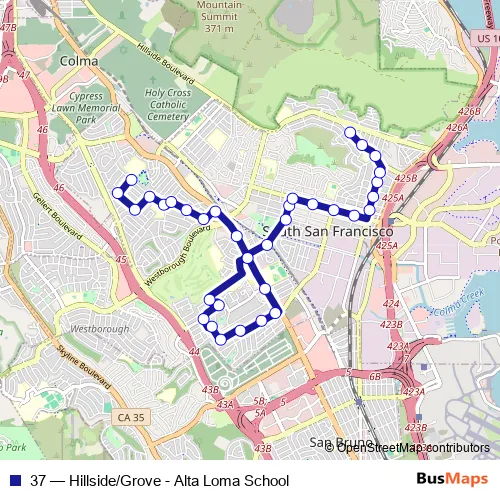 The first stop of the 37 bus route is Del Monte Ave & Romney Ave and the last stop is Hillside Blvd & Grove Av. 37 (Hillside/Grove - Alta Loma School) is operational during on weekdays.