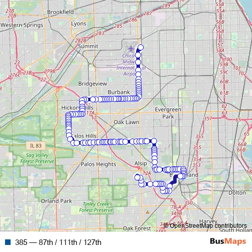 The first stop of the 385 bus route is Midway CTA Station and the last stop is Rivercrest Center (4971 W Cal Sag Rd). 385 (87th / 111th / 127th) is operational during on weekdays.
