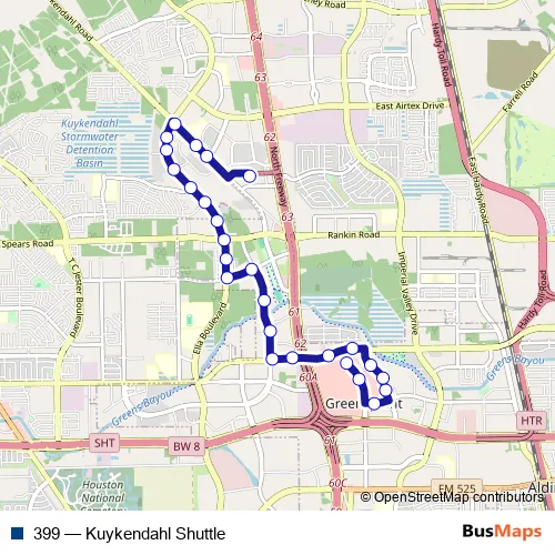 The first stop of the 399 bus route is Greenspoint Transit Center and the last stop is Kuykendahl Park & Ride. 399 (Kuykendahl Shuttle) is operational during everyday.