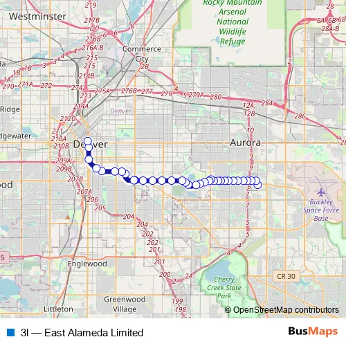 The first stop of the 3l bus route is Aurora Metro Center Stn Gate F and the last stop is Civic Center Station (16th Drop-Off). 3l (East Alameda Limited) is operational during on weekdays.