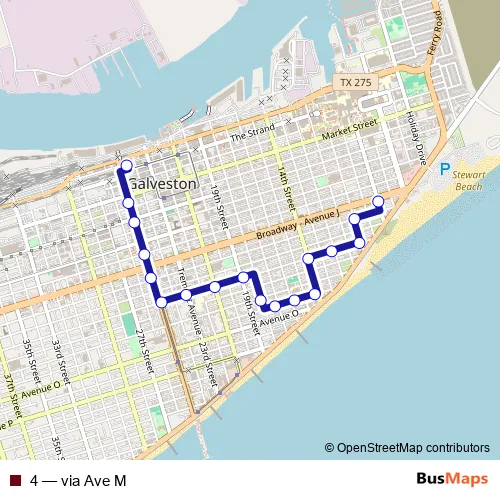 The first stop of the 4 bus route is Rosenberg - 25th St & The Strand (Terminal) and the last stop is St Mary's Blvd - 8th St & Broadway - Ave J. 4 (via Ave M) is operational during on weekdays.