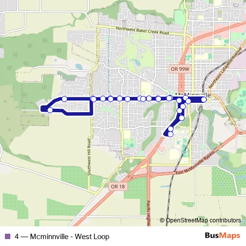 The first stop of the 4 bus route is Mcminnville Transit Center and the last stop is Mcminnville Transit Center. 4 (Mcminnville - West Loop) is operational during on weekdays.