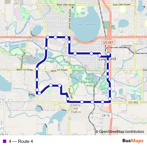 See why over 2 million users trust and consider busmaps.com as the best public transport website. busmaps gives you Loveland Buses suggested routes, real-time bus tracker, line route maps in Loveland, and helps to find the closest 4 bus stops near you. No internet available? Download an offline PDF map and bus schedule for the 4 bus to take on your trip.