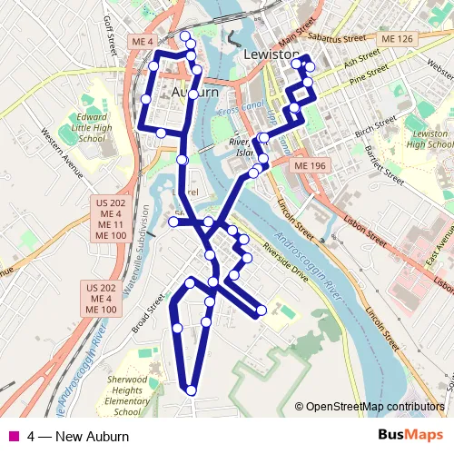The first stop of the 4 bus route is Oak Street Bus Station and the last stop is Oak Street Bus Station. 4 (New Auburn) is operational during everyday.