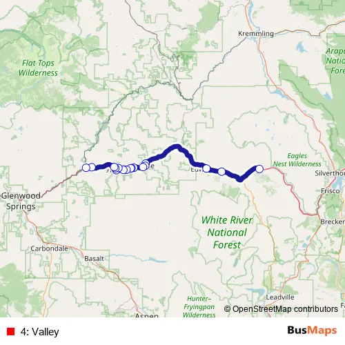The first stop of the 4: Valley bus route is Vail Transportation Center and the last stop is Two Rivers-Dotsero. 4: Valley is operational during everyday.