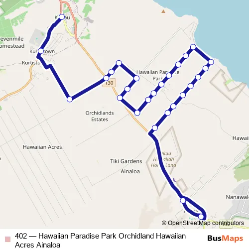 The first stop of the 402 bus route is Kea'au Pahoe Road @ Kahakai Blvd (Puna Kai Shopping Center) and the last stop is Old Volcano Road @ Keaau-Pahoa Road (Hmsa building, farside). 402 (Hawaiian Paradise Park Orchidland Hawaiian Acres Ainaloa) is operational during everyday.