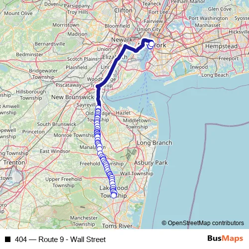 The first stop of the 404 bus route is Greenwich St. Btw Morris & Battery Pl (Parkway Express) and the last stop is Lakewood - Rt 9 @ Pine St (Southbound). 404 (Route 9 - Wall Street) is operational during on weekdays.
