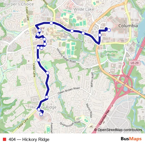The first stop of the 404 bus route is Hickory Ridge Village Center / Giant and the last stop is Mall in Columbia. 404 (Hickory Ridge) is operational during everyday.