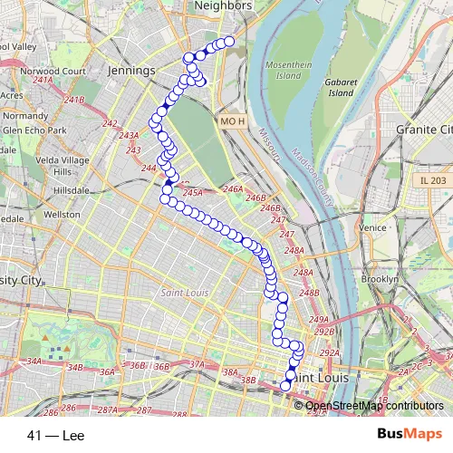 See why over 2 million users trust and consider busmaps.com as the best public transport website. busmaps gives you St. Louis Buses suggested routes, real-time bus tracker, line route maps in St. Louis, and helps to find the closest 41 bus stops near you. No internet available? Download an offline PDF map and bus schedule for the 41 bus to take on your trip.