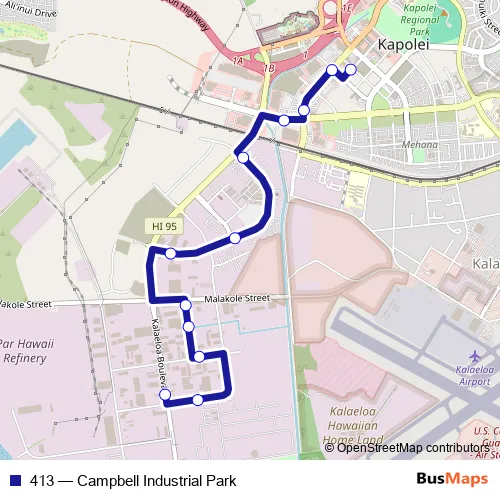 The first stop of the 413 bus route is Kalaeloa BL + Komohana St and the last stop is Kapolei Transit Center - Stop 3. 413 (Campbell Industrial Park) is operational during on weekdays.