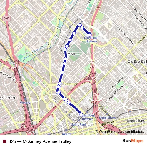 The first stop of the 425 tram route is Federal @ Olive - E - Ns and the last stop is Cityplace/Uptown West. 425 (Mckinney Avenue Trolley) is operational during everyday.