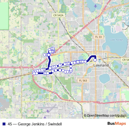 The first stop of the 45 bus route is Lakeland Downtown Terminal and the last stop is Lakeland Downtown Terminal. 45 (George Jenkins / Swindell) is operational during on weekdays.