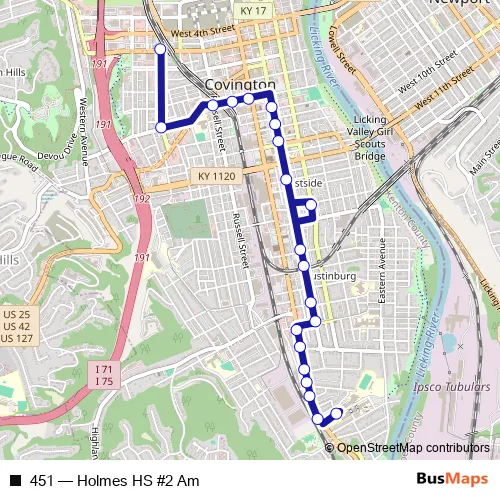 The first stop of the 451 bus route is Main at 4th and the last stop is Holmes High School. 451 (Holmes HS #2 Am) is operational during on weekdays.