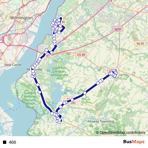 The first stop of the 468 bus route is Woodstown Acme# and the last stop is Carneys Point SNR Apts#. 468 is operational during everyday.
