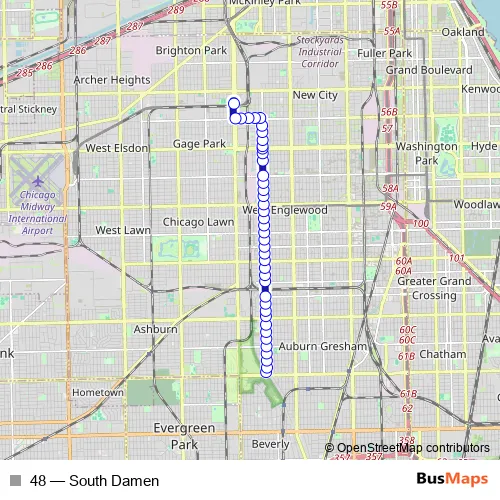 The first stop of the 48 bus route is Damen & 87th Street Terminal and the last stop is Western Orange Line Station. 48 (South Damen) is operational during on weekdays.
