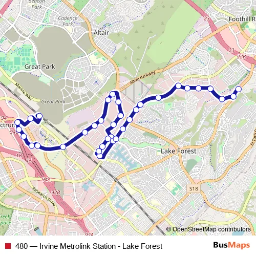 The first stop of the 480 bus route is Irvine Station-Dock 1 and the last stop is Lake Forest-Regency. 480 (Irvine Metrolink Station - Lake Forest) is operational during on weekdays.