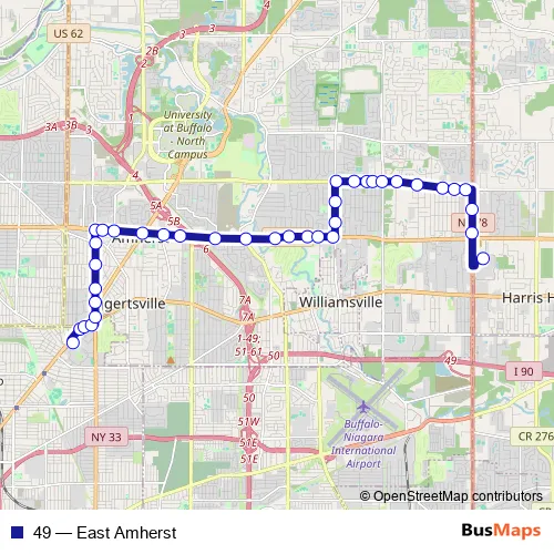 The first stop of the 49 bus route is Main Street & University Station and the last stop is Transit Road & Eastern Hills Mall. 49 (East Amherst) is operational during on weekdays.