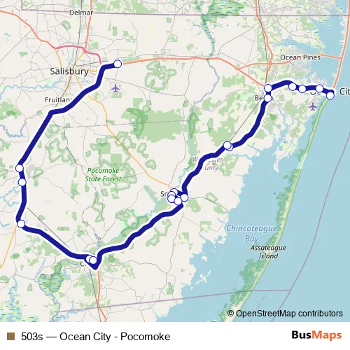 The first stop of the 503s bus route is Ocean City Transfer Point and the last stop is Shore Transit Bus Terminal. 503s (Ocean City - Pocomoke) is operational during everyday.