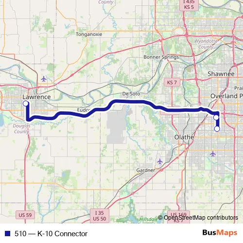 The first stop of the 510 bus route is KU Edwards and the last stop is Central Station. 510 (K-10 Connector) is operational during on weekdays.