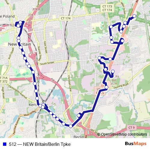 The first stop of the 512 bus route is Downtown New Britain Station @ Bay T and the last stop is Ctdot @ opp Main Entrance. 512 (NEW Britain/Berlin Tpke) is operational during everyday.