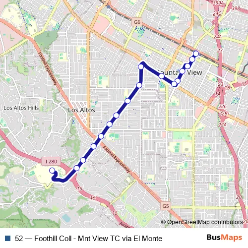 The first stop of the 52 bus route is Mountain View Transit Center (Bay 4) and the last stop is Foothill College. 52 (Foothill Coll - Mnt View TC via El Monte) is operational during on weekdays.