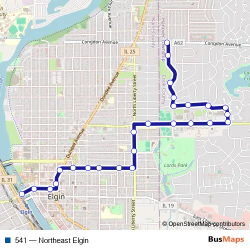 The first stop of the 541 bus route is Congdon Ave & Hiawatha Dr and the last stop is Elgin Transportation Center Bay 2. 541 (Northeast Elgin) is operational during everyday.